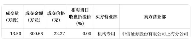 以岭药业10月30日大宗交易平台出现一笔成交,成交量13.50万股,成交金额300.65万元,大宗交易成交价为22.27元。该笔交易的买方营业部为机构专用,卖方营业部为中信证券股份有限公司上海分公司。