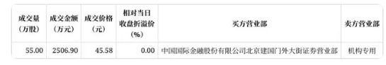 亿纬锂能11月1日大宗交易平台出现一笔成交,成交量55.00万股,成交金额2506.90万元,大宗交易成交价为45.58元。该笔交易的买方营业部为中国国际金融股份有限公司北京建国门外大街证券营业部,卖方营业部为机构专用。