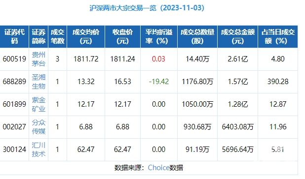 11月3日,贵州茅台、圣湘生物、紫金矿业、分众传媒、汇川技术等公司均发生大宗交易,具体情况如下表: