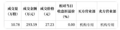 光迅科技11月3日大宗交易平台出现一笔成交,成交量10.78万股,成交金额293.59万元,大宗交易成交价为27.23元。该笔交易的买卖双方均为机构专用席位。